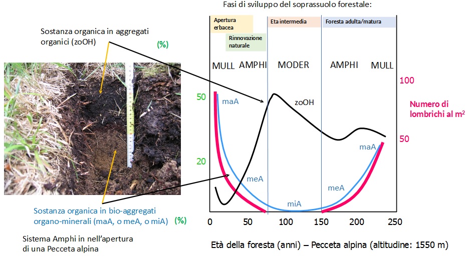 Questo implica che nel suolo gli animali si muovano, cambiando il suolo sotto gli alberi. Quanto indicato da Nicolas Bernier è stato confermato da indagini condotte in peccete trentine (Fig. 1). La crescita degli alberi comporta un incremento dello sviluppo delle chiome e quindi della copertura del suolo il quale si raffredda e cambia struttura. Un po’ alla volta i giovani alberi, nella loro crescita, perdono gli aghi ed i rami più bassi e poi muoiono per concorrenza, lasciando il posto ad alcuni di loro che andranno a formare la foresta adulta. Il suolo accumula sostanza organica in superficie, e perde invece quella nel suolo, perché mineralizzata e assorbita dalle radici. Gli alberi maturi, che si ritrovano ,più distanziati tra loro, permettendo al sole di penetrare in sun fleck, producono più sostanza organica che investono nel suolo sottoforma di alimenti per i microrganismi (essudati radicali). I microrganismi rispondono ossidando la sostanza organica accumulata in superficie e trasformata dagli artropodi. In questo modo attirano i lombrichi che arrivano e mescolano nel loro intestino la parte minerale ed organica del suolo, espellendo aggregati organo-minerali molto stabili (resistono molto bene all’azione disaggregante dell’acqua piovana). In tali aggregati vanno ad alimentarsi le radici degli alberi che approfittano di un periodo di abbondanza per preparare la generazione futura. Migliaia di semi vengono prodotti: una parte di questi nutrono la fauna dentro e fuori dal suolo, ma un’altra parte va a costituire la banca di seme del suolo. Alla fine del ciclo della foresta nella fase senescente di decrepitezza (200-250 anni per un ciclo selvicolturale; 2-4 volte più lungo in una pecceta naturale) il soprassuolo si autodistrugge, gli alberi cadono coinvolgendo la stratificazione del suolo. Nelle aperture create arriva la luce che richiama acqua dalla falda, attiva la pedofauna che ricicla più rapidamente la lettiera generando risorse disponibili per la formazione del nuovo bosco. I semi risentono di questi cambiamenti e germinano. Un nuovo ciclo della foresta ricomincia.