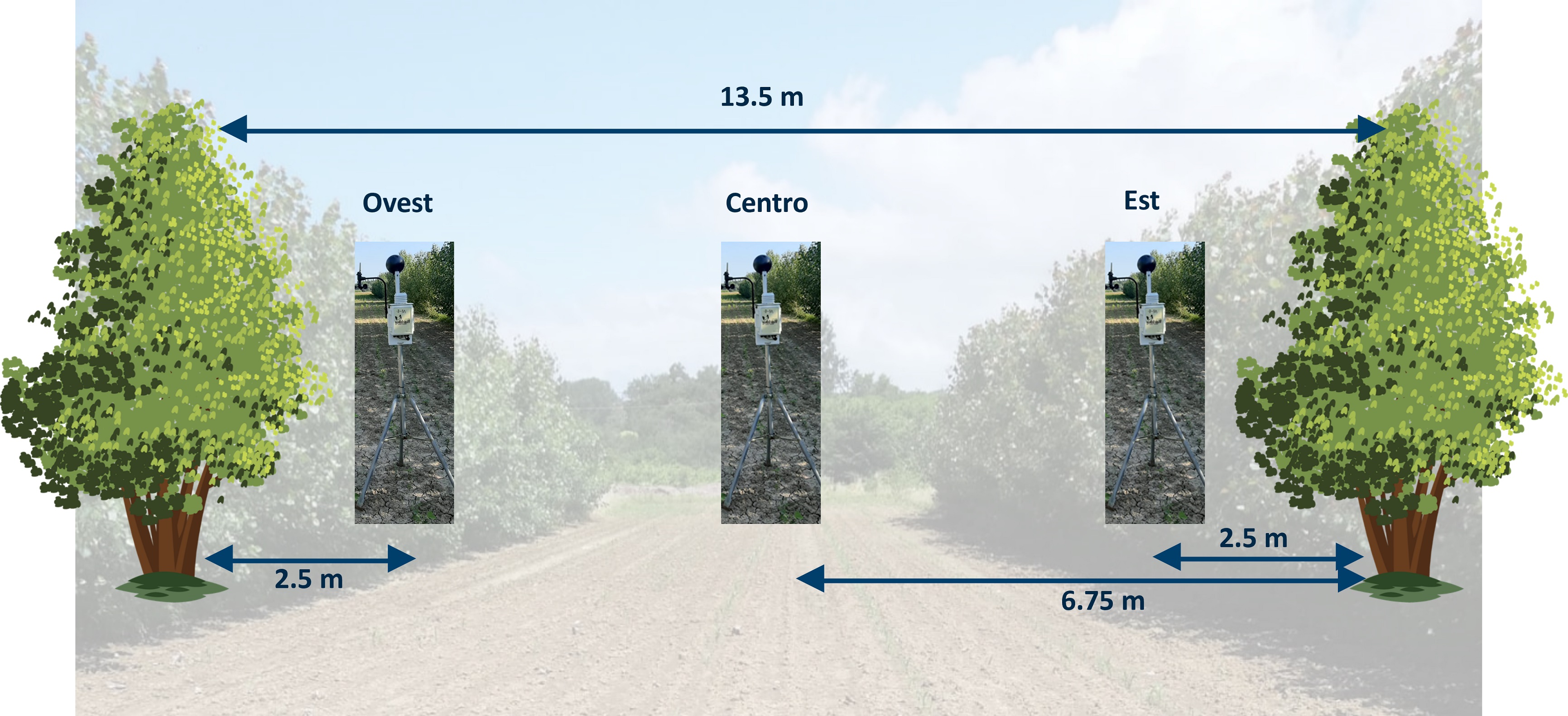 La prova svolta presso il CiRAA (PI) e ospitata da un appezzamento di 1.2 ha costituito da filari di pioppo (Nord-Sud) destinati alla produzione di biomassa (SRC), ha raccolto i dati provenienti da tre stazioni meteorologiche posizione nell’interfilare (13.5 m) alle distanze di 2.5 m (Ovest), 6.75 (Centro) e 2.5 m (Est) (Fig. 1). Un’ultima capannina di controllo è stata posizionata in pieno sole a circa 200 m dai filari.