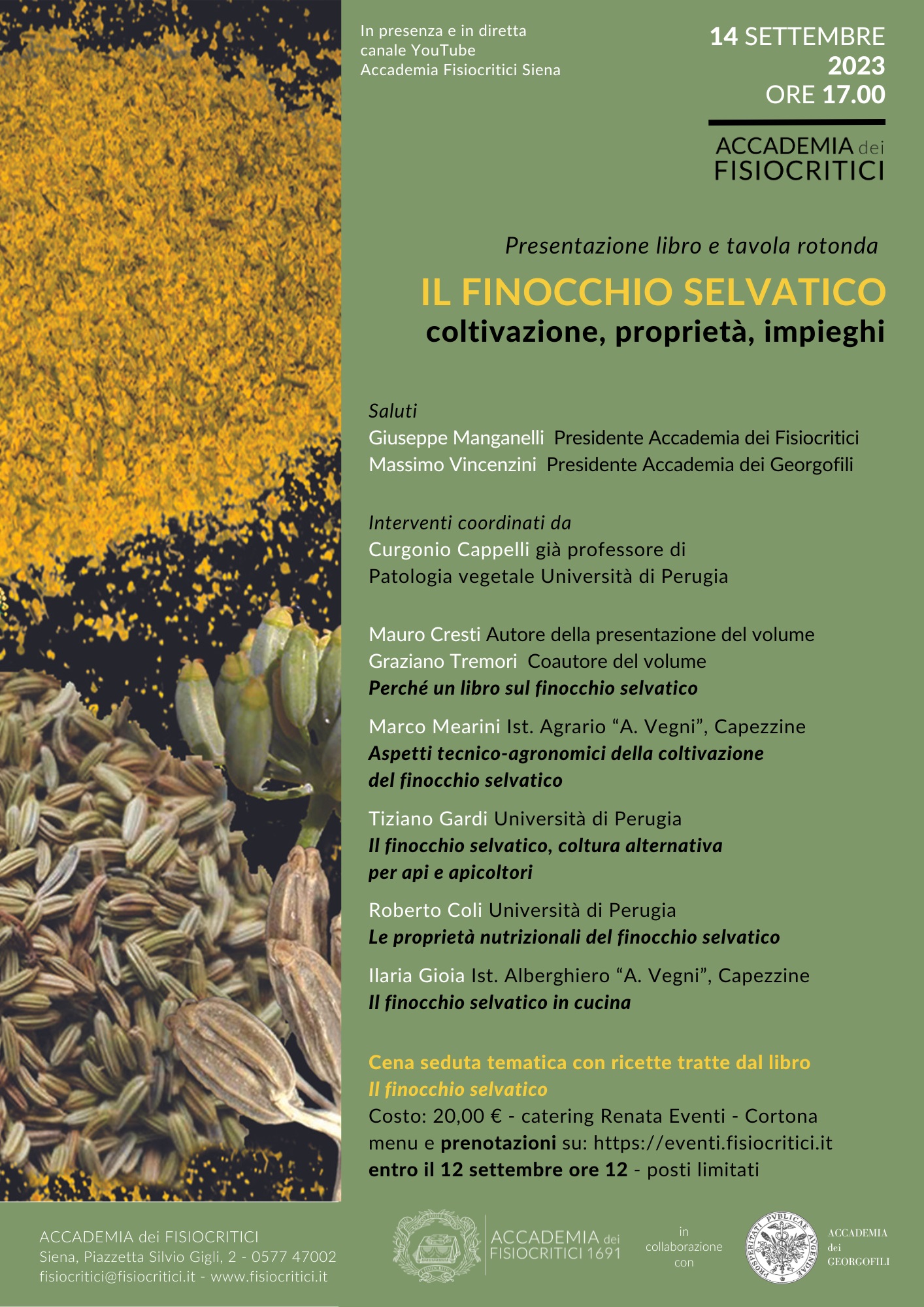Al termine del pomeriggio i corridoi del Museo di Storia Naturale dell’Accademia dei Fisiocritici si trasformeranno in sala da pranzo per far gustare ai partecipanti prenotati molti piatti con il finocchietto secondo le ricette tratte dal libro appena presentato.