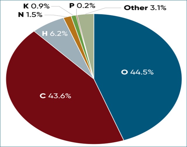 • Scheletri di carbonio e acqua: idrogeno (H) e ossigeno (O) si combinano con il carbonio (C) per formare carboidrati (zuccheri, amido, cellulosa) che costituiscono le pareti cellulari, le membrane e i tessuti di stoccaggio. La cellulosa, il principale polimero strutturale, è composta per il ~44% di ossigeno, in massa, e contiene abbondante idrogeno.