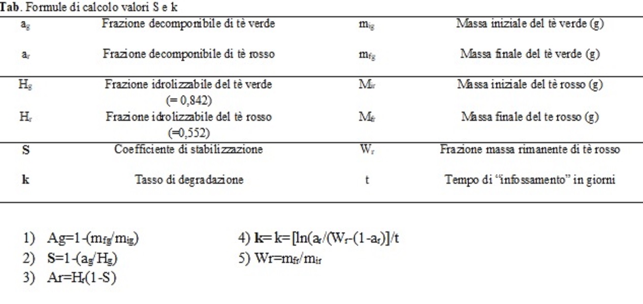 Il calcolo degli indici (S) e (k) può essere effettuato mediante formule oppure inviando i dati sullo specifico portale del progetto “Tea Bag Index” (http://www.teatime4science.org/) che restituisce i valori elaborati.