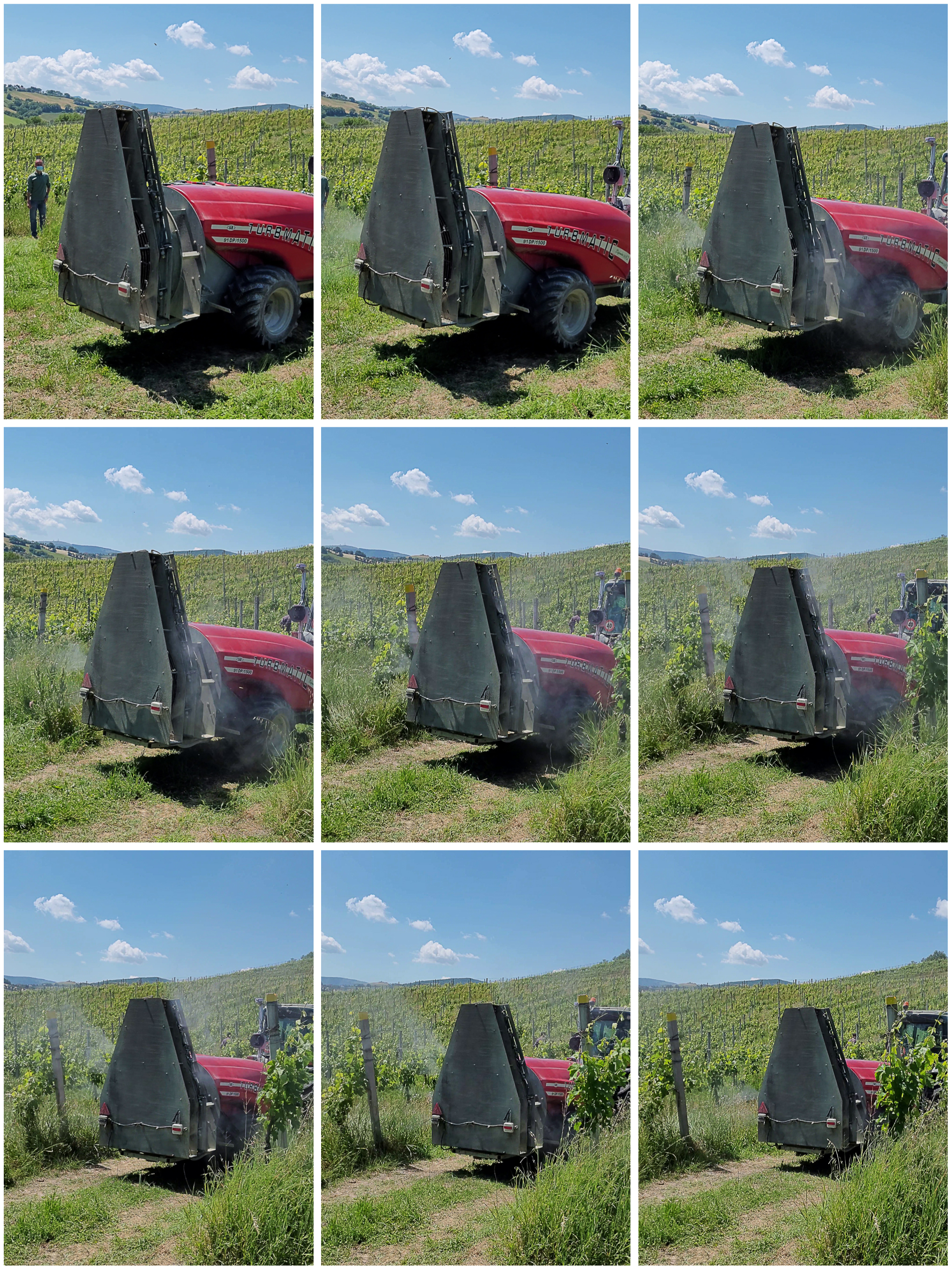 I test sono stati condotti in un vigneto con elevata presenza di fallanze. L’appezzamento è stato diviso in due sezioni, ognuna destinata rispettivamente all’allestimento dell’atomizzatore con sistema LiDAR e con sistema Standard. In ogni sezione sono stati selezionati i filari da campionare, divisi a loro volta in tre blocchi. All’interno di ogni blocco sono state scelte, randomizzate, 30 aree di saggio: 15 in corrispondenza di vuoti e fallanze e 15 con vegetazione ben sviluppata e uniforme, per un totale di 180 aree di saggio. In ogni area di saggio sono state posizionate 3 cartine idrosensibili, Globalmente, sono state analizzate 450 cartine, raccolte in due rilievi effettuati nei mesi di giugno e luglio 2022 (Figura 1 successione di fotogrammi raffiguranti la distribuzione sitospecifica del prodotto fitosanitario operata dal prototipo.jpg).