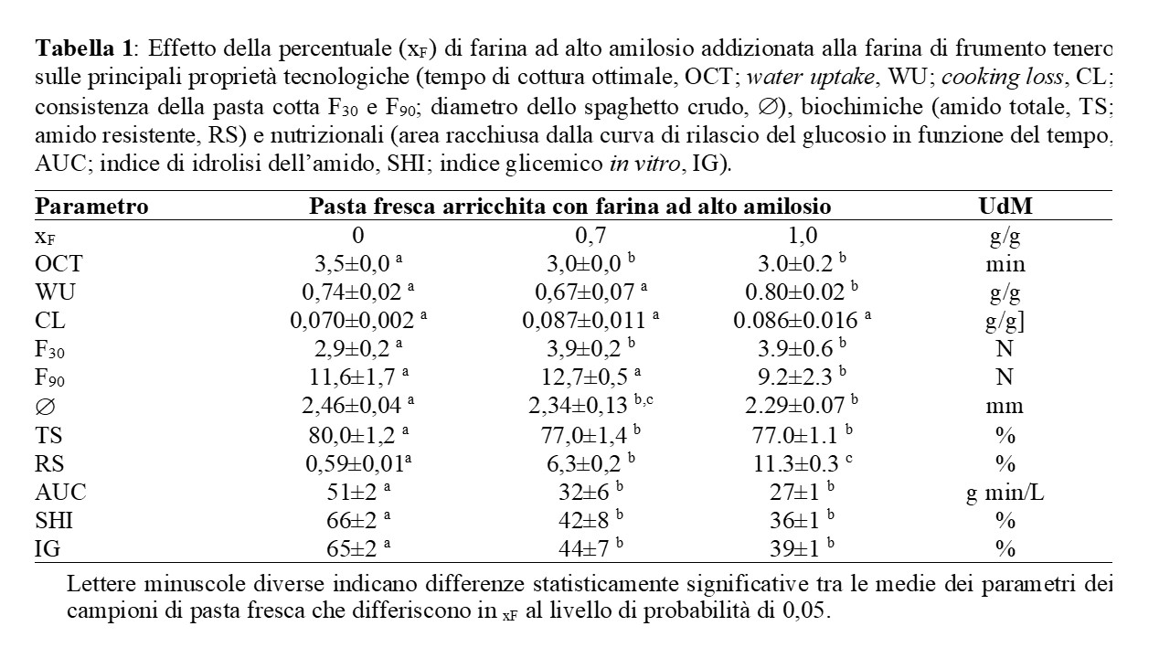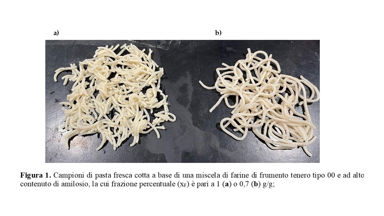 Da una linea ad alto contenuto di amilosio derivata dalla cultivar di frumento tenero Cadenza (https://doi.org/10.1111/pbi.12908), coltivata in pieno campo in diverse annate, si è ottenuta una farina di grano tenero ad alto contenuto di amilosio, che è stata miscelata in diverse percentuali con una farina commerciale di grano tenero 00 per produrre una pasta fresca (spaghetti), onde determinarne le principali proprietà biochimiche (amido totale, amido resistente), tecnologiche (tempo di cottura ottimale; acqua assorbita dalla pasta cotta; cooking loss; consistenza della pasta cotta tramite test dinamometrici) e nutrizionali (indice glicemico).