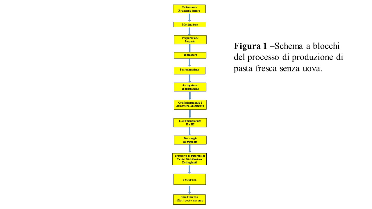 Si riporta in Figura 1 (link Figura 1 - LCA.jpg) lo schema a blocchi del ciclo di vita (dalla culla alla tomba) della pasta alimentare fresca senza uova. La pasta fresca estrusa viene refrigerata e confezionata in sacchetti di politene in un’atmosfera modificata (N2 e CO2), onde prolungarne il tempo di conservazione in frigo fino a 60 giorni. Completato il confezionamento secondario in scatole di cartone e quello terziario in pallet, il prodotto viene conservato in celle frigo a ~5 °C, poi trasportato su furgoni isotermici ai punti di vendita. La fase d’uso include la conservazione in frigo per circa 30 giorni e la cottura di 1 kg di pasta fresca in 10 L di acqua bollente contenente 100 g di sale da cucina per il tempo di cottura ottimale indicato nel sacchetto. Una meta-analisi effettuata utilizzando il database Scopus con i temi di ricerca profilo ambientale, analisi del ciclo di vita e pasta fresca nei campi di ricerca relativi al titolo, riassunto e parole chiave non ha rilevato alcun documento sul profilo ambientale di alcun tipo di pasta fresca.