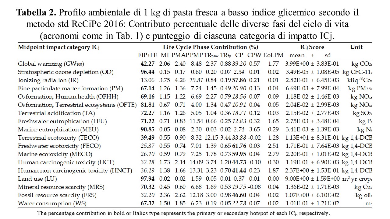 In Tabella 2 (link Tabella 2 - LCA.jpg) sono riportati le categorie di impatto ambientale riferite ad un’unità funzionale di pasta fresca ad alto amilosio conformemente al metodo standard ReCiPe 2016.