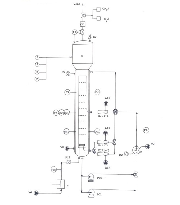 Una pompa centrifuga autoadescante (PC-1) ricircola il brodo di coltura attraverso lo scambiatore di calore a spirale (E), mentre un'altra pompa centrifuga autoadescante (PC-2) alimenta 9 eietto-ri G-L convergenti-divergenti (EJA1-6 a EJB1-3) per aerare il fermentatore. Diversi rotametri (FIC) sono stati utilizzati per misurare le portate gassose e liquide, mentre un contatore volumetrico (CV) rilevava il volume del gas effluente.