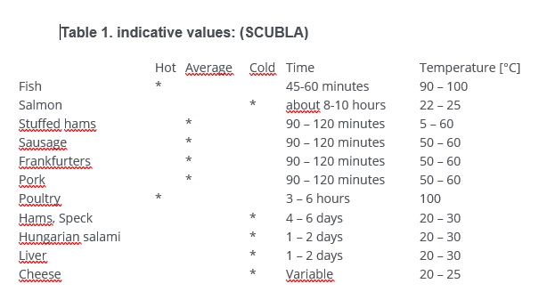1. La procedura di affumicatura a caldo avviene a temperature comprese tra 50 e 90°C in macchine a tunnel. Per ottenere una vera e propria contemporanea cottura degli alimenti, viene monitorata la temperatura all'interno degli alimenti. Il tempo di affumicatura a caldo è generalmente più breve e dipende dalle dimensioni del cibo. Con questo metodo, ci si aspetta una perdita di peso del 5-30%. Gli alimenti a cui di solito viene applicata l'affumicatura a caldo sono i wurstel, il prosciutto di Praga, le aringhe e la pancetta affumicata.