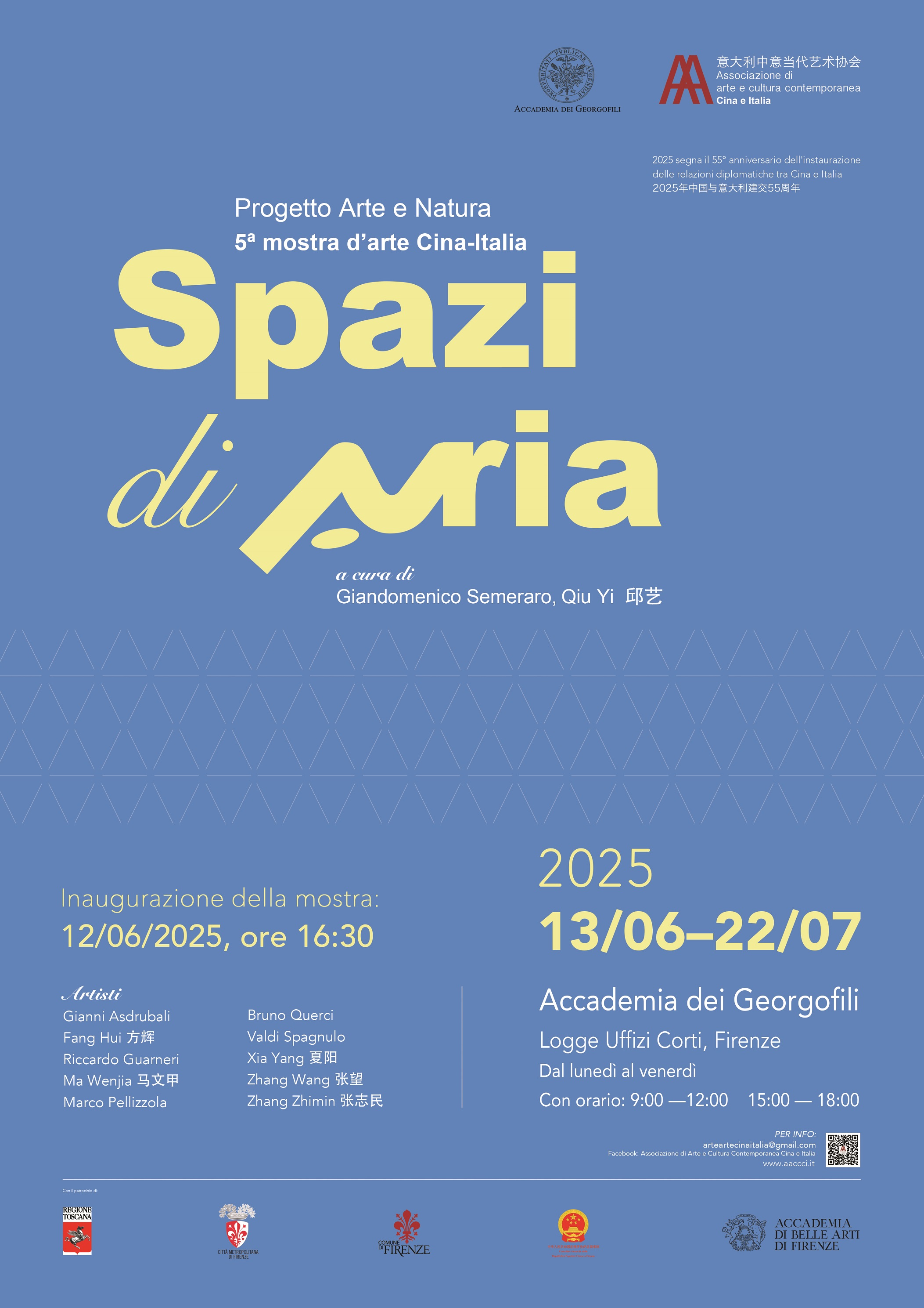 Si inaugura giovedì 12 giugno alle ore 17.30, nella sede dell'Accademia dei Georgofili,la mostra "SPAZI DI ARIA" organizzata in collaborazione con l'Associazione di Arte e Cultura Contemporanea Cina e Italia, con il patrocinio di Regione Toscana, Comune di Firenze, Consolato Generale della Repubblica Popolare Cinese a Firenze e Accademia di Belle Arti.